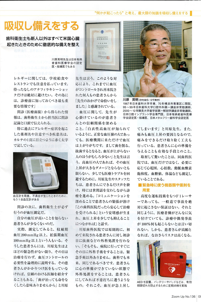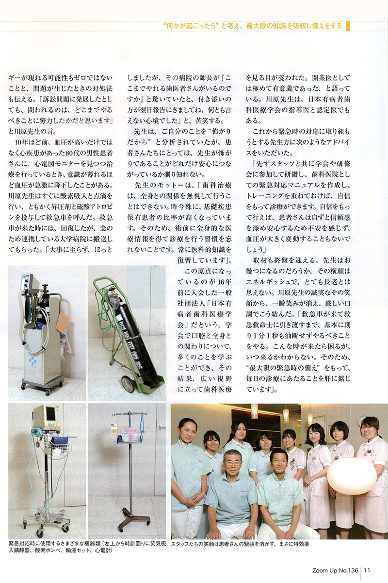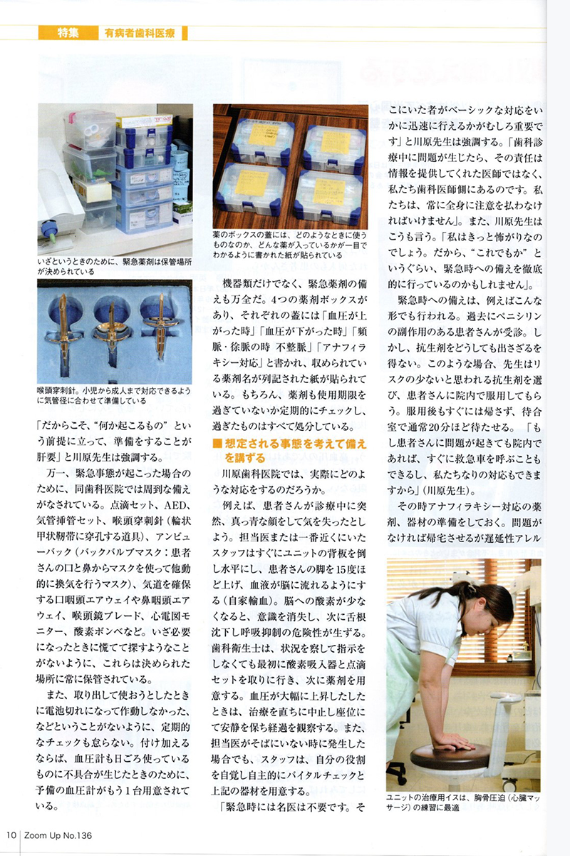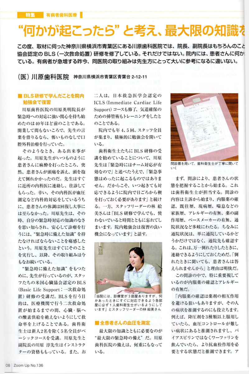 歯科医療雑誌のZoom Up(2013年:No.136)の「特集:有病者歯科医療」に掲載された記事「何かが起こったらと考え、最大限の知識を吸収し備えをする」を紹介いたします。